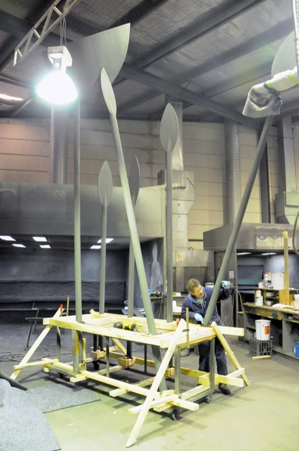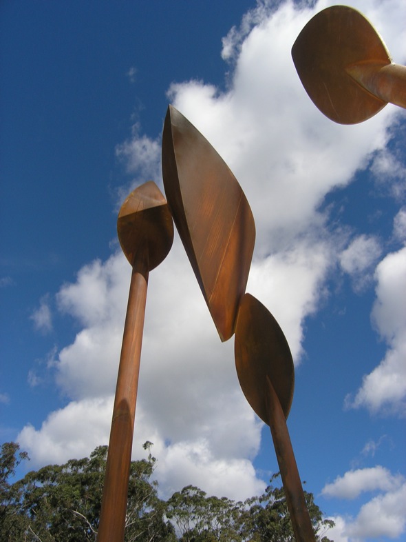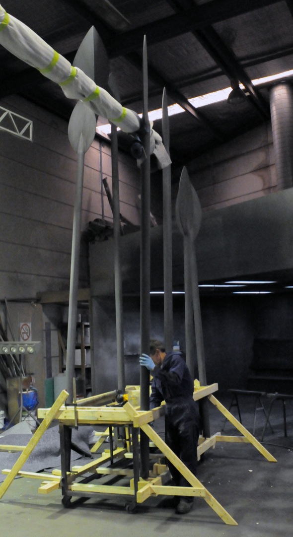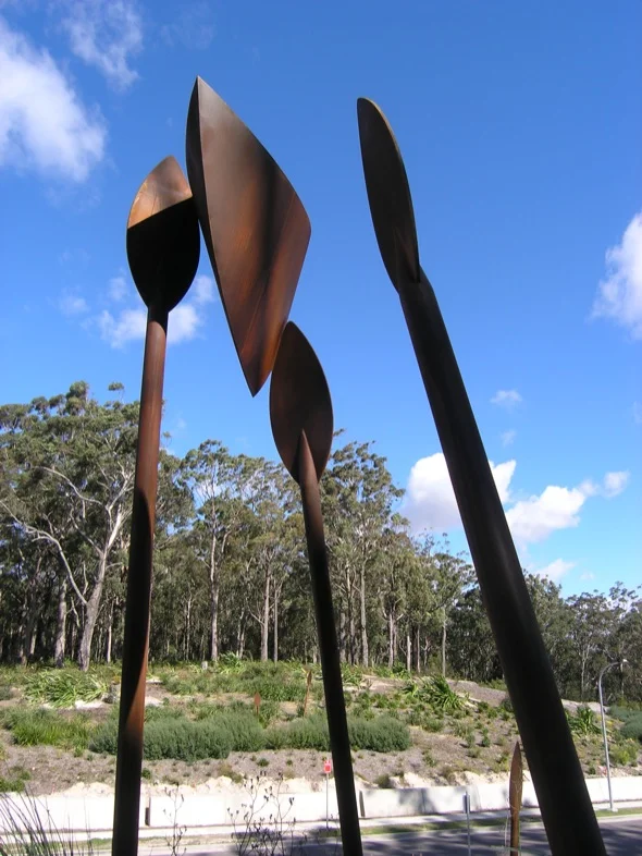 Description: A History Passed is a ‘gateway’ piece to a development in Port Stephens traversing the ridge top cutting on Spinnaker Way. Here six oar or spear-like forms appear to be carrying an abstract boat shape through the landscape. The work is intended as a metaphor for the passing on of the knowledge and history of the site.