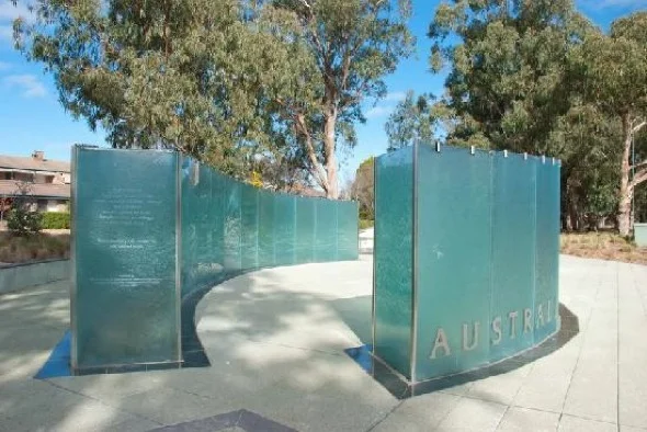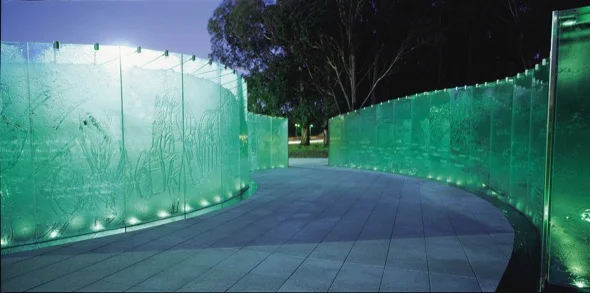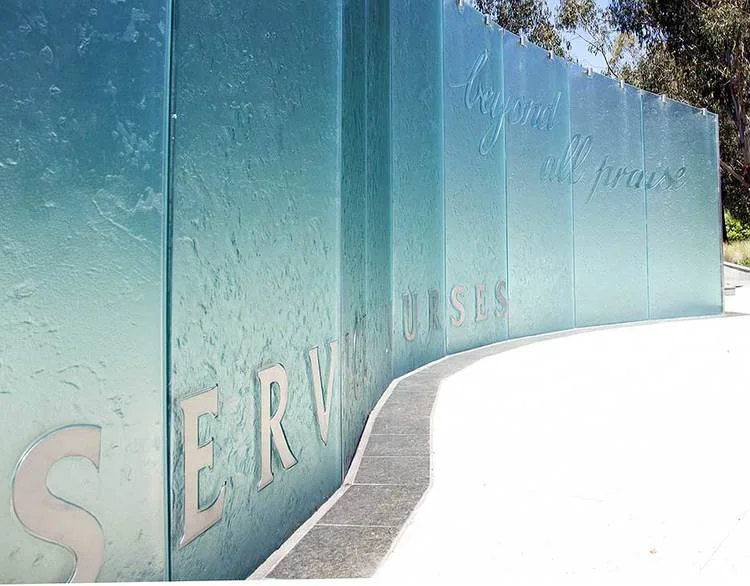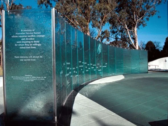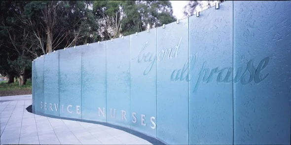 This memorial, designed by Robin Moorhouse is made of cast glass. Etched and cast into the inner glass walls are text and images, in a timeline sequence, portraying the history and contribution of Australian Service Nursing. The memorial also includes a collage of historical photographs and extracts from diaries and letters, in the original handwriting.