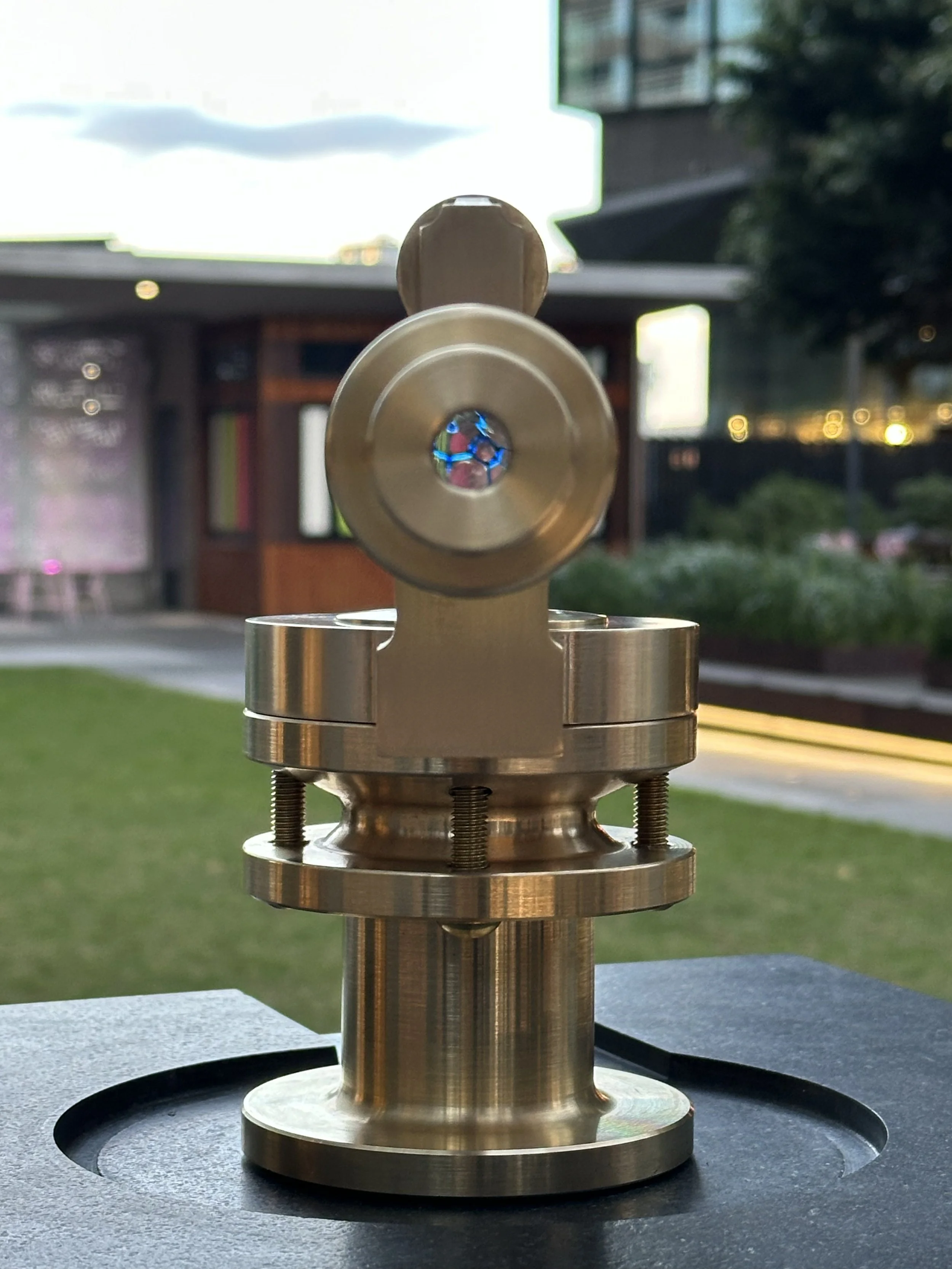 This free-standing sculptural form invites people of all ages to engage. The telescope holds a hidden dimension: the pattern language is only revealed when a visitor looks through its lens, creating a moment of discovery and reflection.