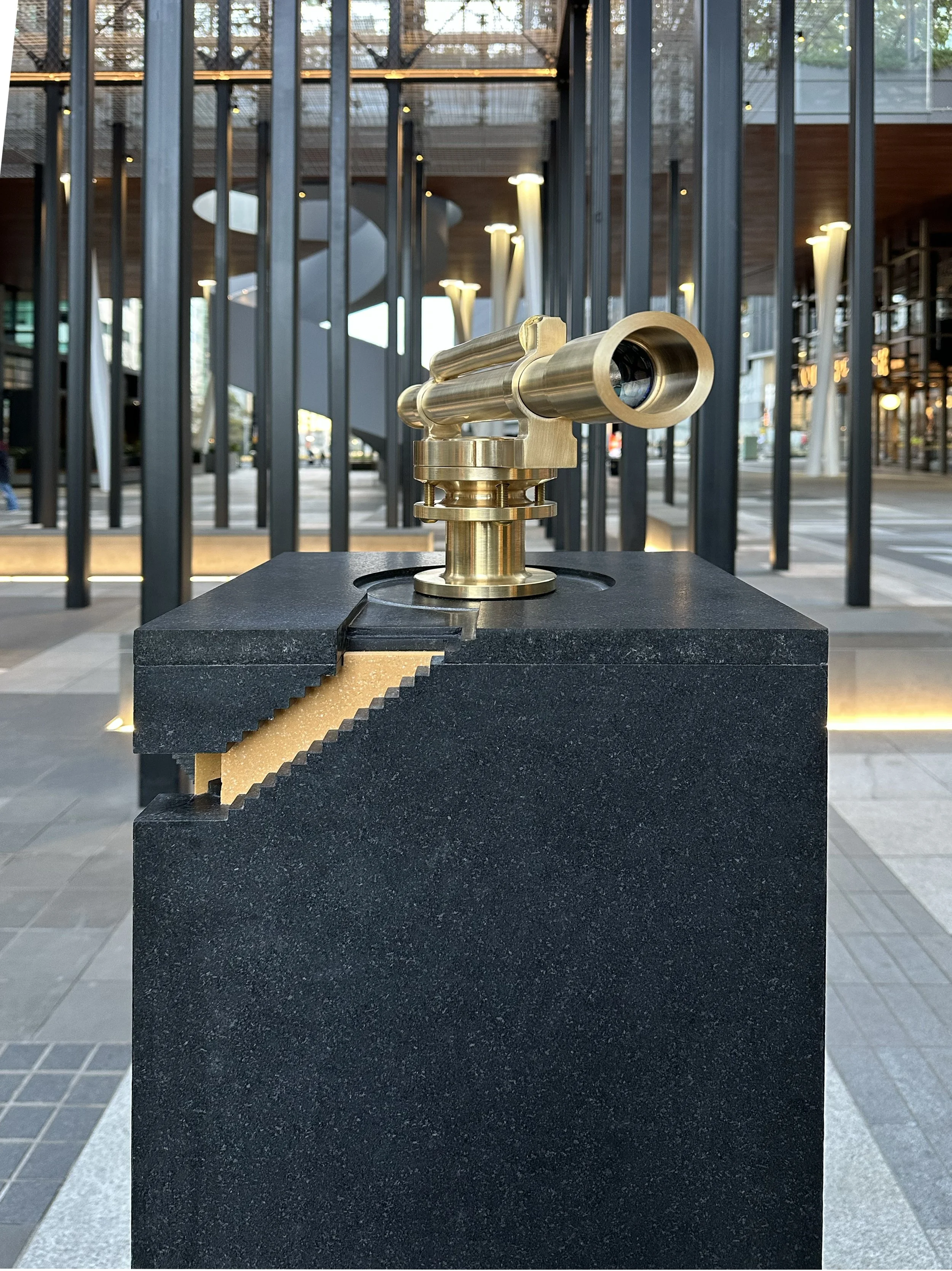To acknowledge the immense significance of this location in Melbourne’s colonial history, Broached Commissions designed, and Axolotl have created, a symbolic form of exploration — a surveyor’s telescope. Embedded within the work is a pattern language designed by First Nations artist Maree Clarke, whose artistry also defines the services wall mural at Melbourne Quarter.