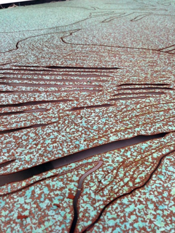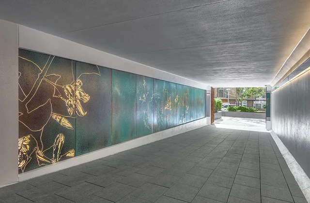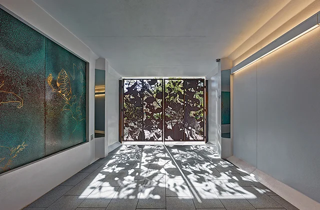The Axolotl 'LINK' glass features an Axolotl Copper coating bonded to frosted laminated glass and then aged with a Verdigris patina. Pamela's artwork was then carved through the metal to allow subtle blades of light to penetrate the surface. The artwork continues through to custom designed, laser cut steel gates at both ends.