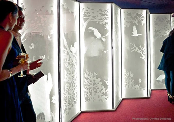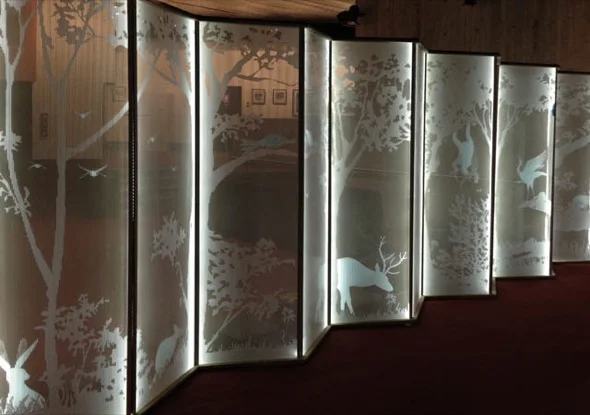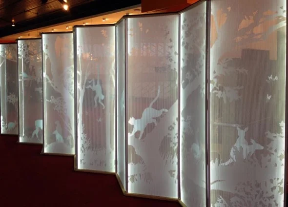Description: Axolotl collaborated closely with Facet Studio to create an awe inspiring glass divider wall using 22 panels of carved and etched glass. Based on the theme of a playful Aesops-Fables-esq scene, the edge lit glass was etched with the theme on the rear face and painted strips on the front to give the passer by a unique experience and insight into the possibilities of the glass medium. The theme comes alive with the effect, as the animals displayed appear to move with every step.