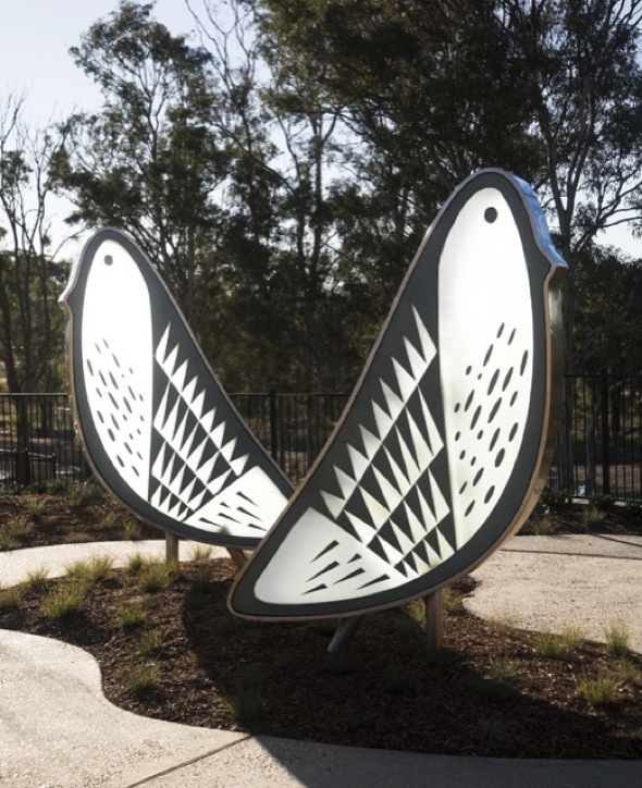 Description: A pair of birds 2.5m high annotates an entry feature and bridge crossing into a new suburban development at Mulgoa Rise.