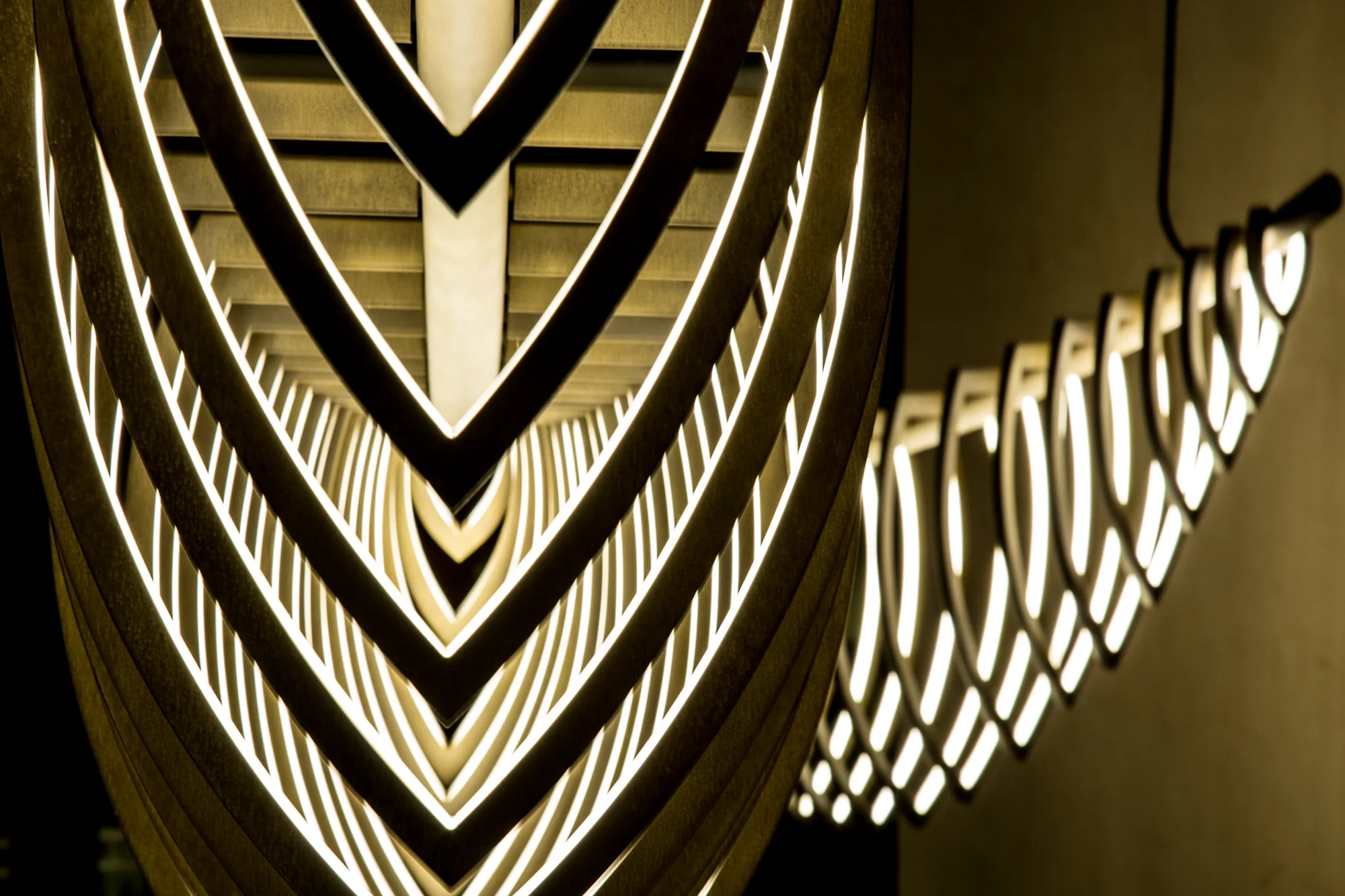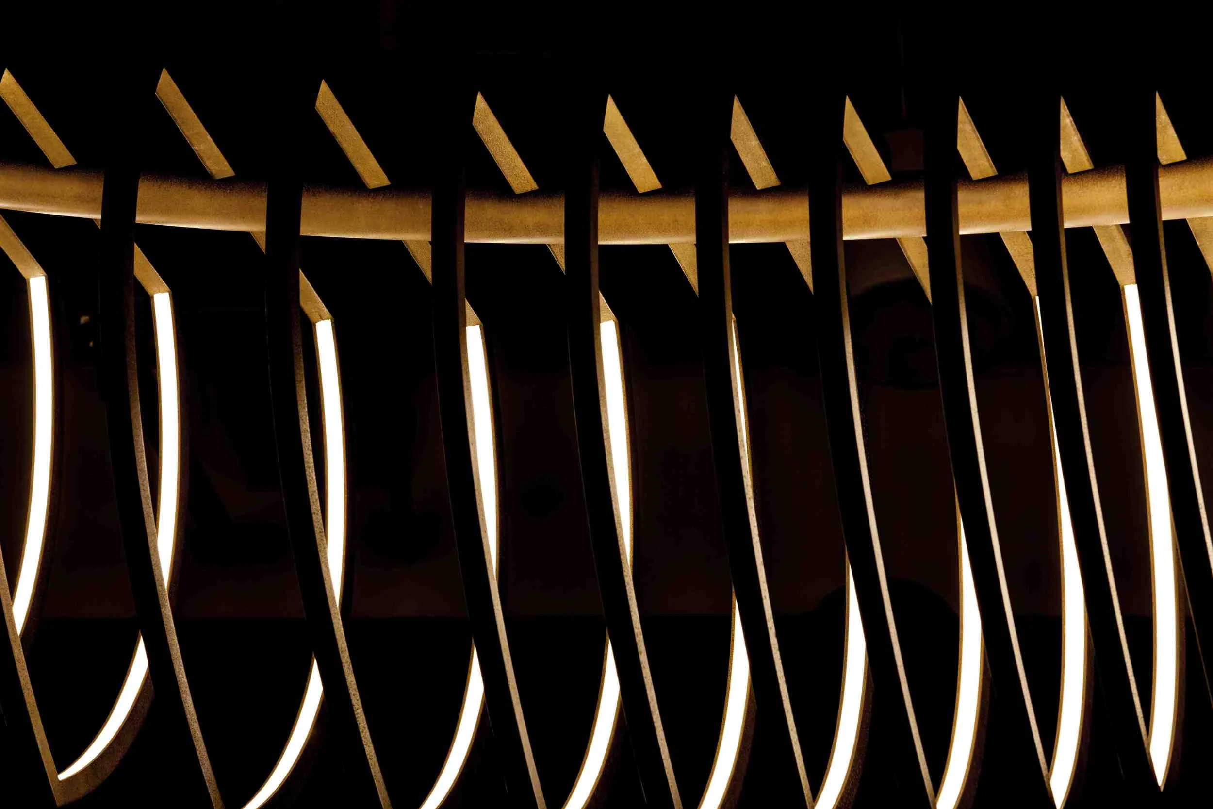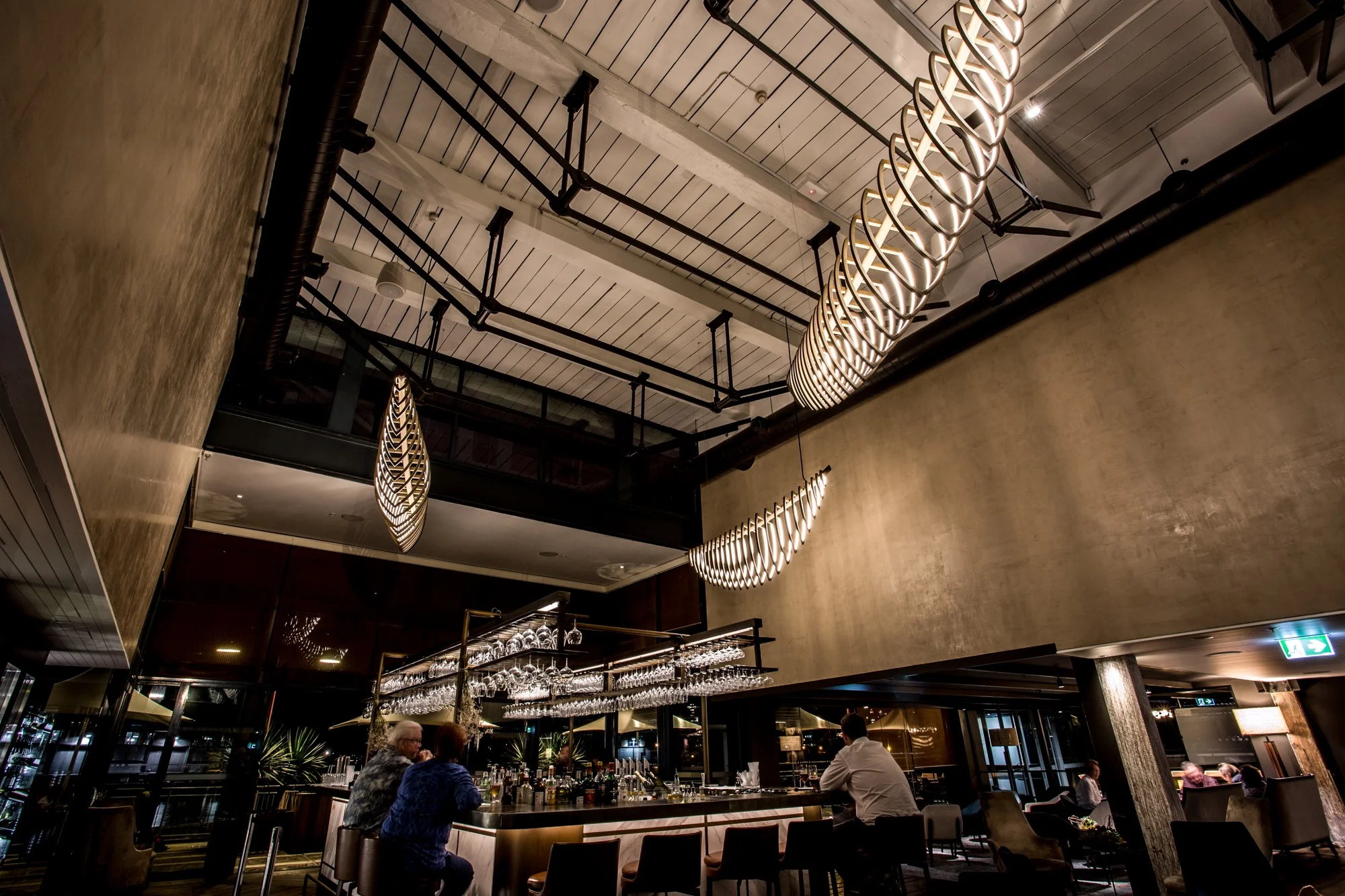 Electrolight's design for the bar and dining areas features a custom light sculpture inspired by the organic form and movement of the ocean's creatures and the way modern yachts replicate these same movements. The commissioned work, named 'Squelette', was both conceptualised and detailed by the Electrolight team in Sydney. The detailed design was quite a process, with over 300 parts requiring site assembly, with all parts suspended utilising gravity to hold it's form. Specialist fabricator Axolotl were appointed to manufacture the piece and were instrumental in the realisation of the work, affording Electrolight the opportunity to create the machined organic forms in a lightweight brass aesthetic using Axolotl’s proprietary metal coating techniques.