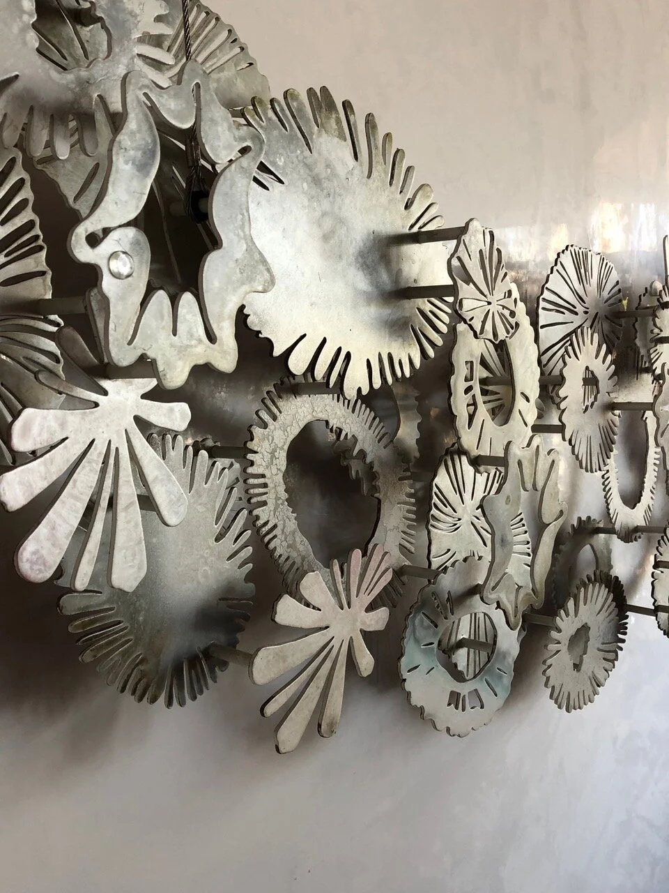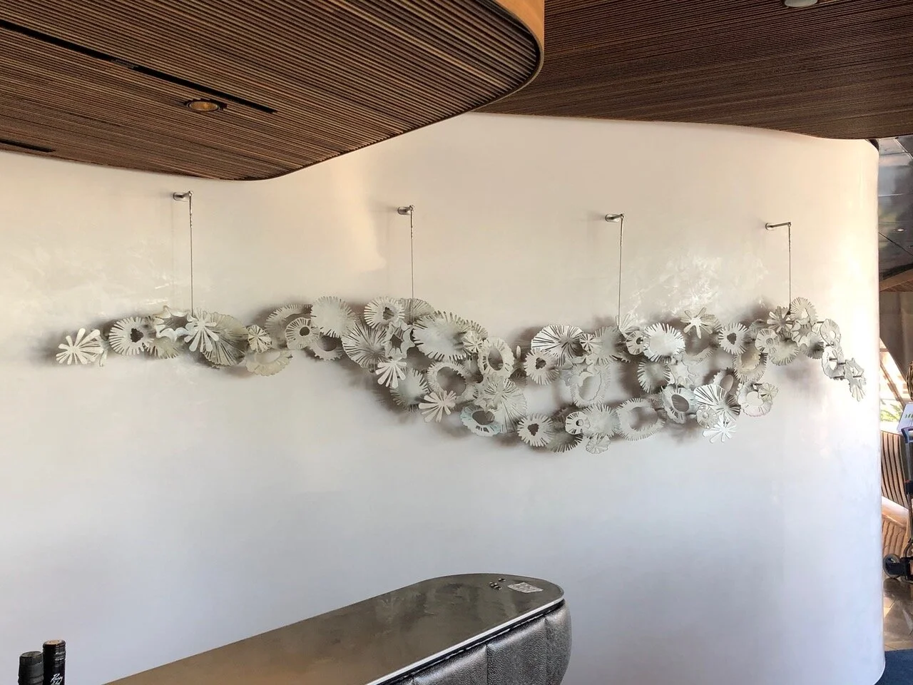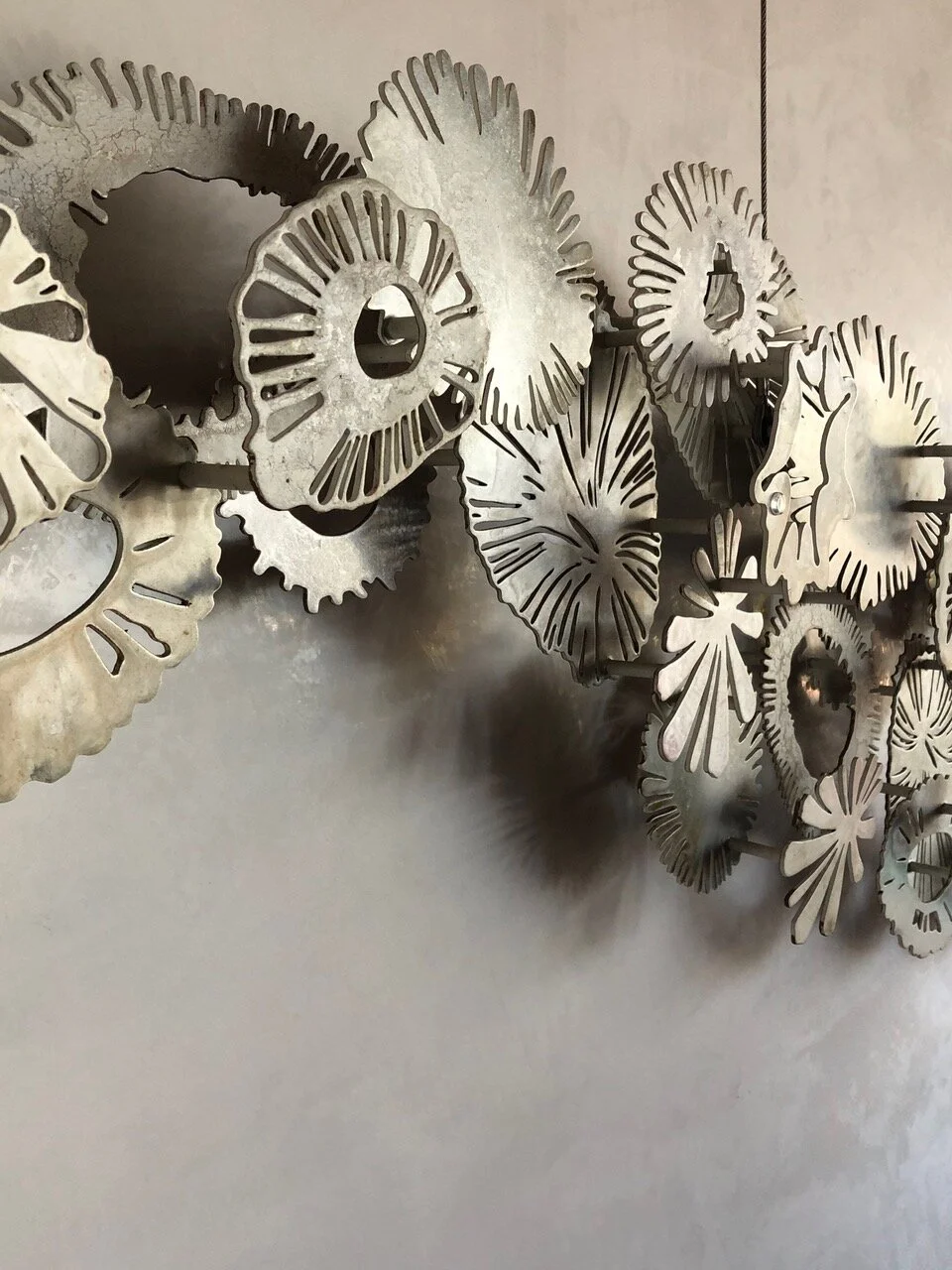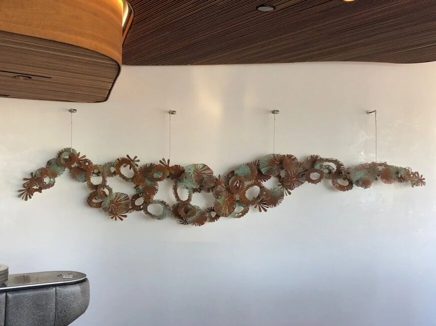 The artwork is a double-sided suspended sculpture constructed of 84 laser cut steel forms welded in a complex three dimensional configuration. Each piece has been individually hand-painted in a mother of pearl effect on one side and coated with Axolotl Applied Metal in Copper Rust Verdigris Patina on the other.