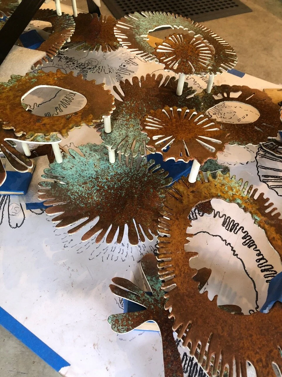 Materials: Laser cut mild steel with Axolotl Applied Metal in Copper Rust Verdigris Patina and Mother of Pearl effect.