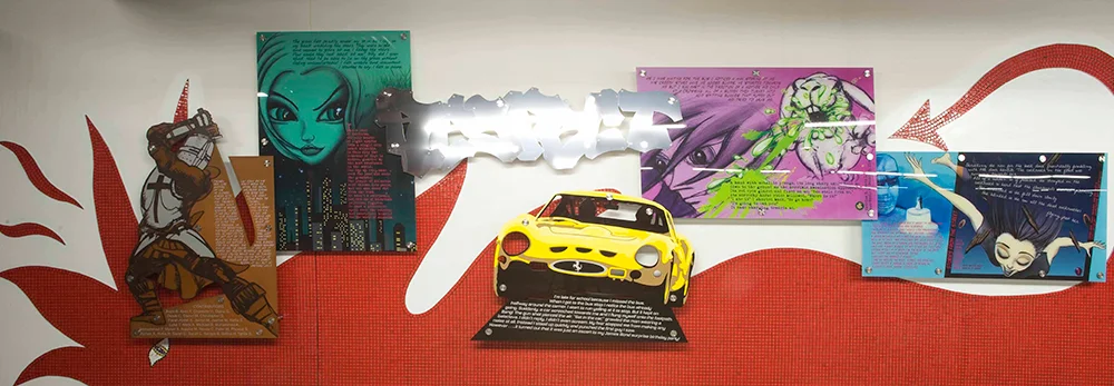 Description: The graffiti installation, designed by Peter Day from Environmental Art and Design, demonstrates the diversity of Axolotl products. The design came out of extensive community engagement with various youth groups - from kids interviewed on the street to young writers and youth council. Overwhelmingly, their response was a desire for greater respect from the community and for their culture, especially visual, to be taken seriously. The kids wrote the stories displayed on the glass panels, and directed & edited the illustrations.