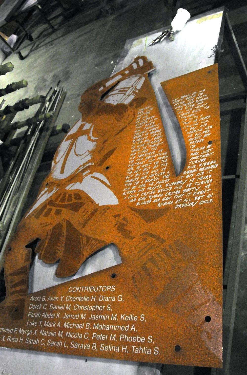 Preference for the materiality of the installation, as indicated by the young artists involved, was for glass, stainless steel and rust, the perfect Axolotl combination. Manufactured from Miro glass cut to complex shapes, rust and mild steel the installation is pin fixed in place at the new Hurstville Bus Exchange.