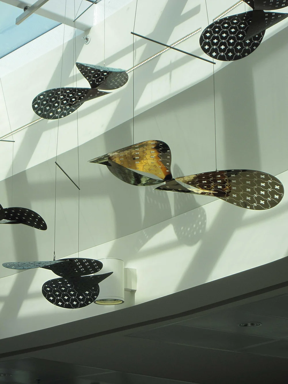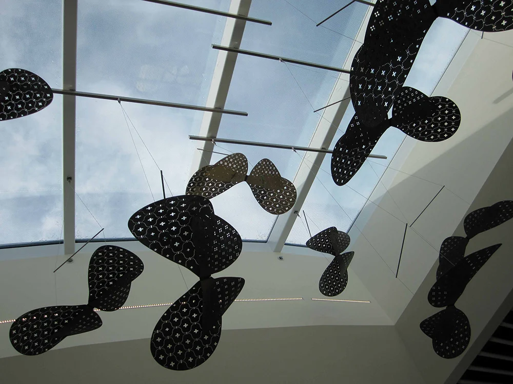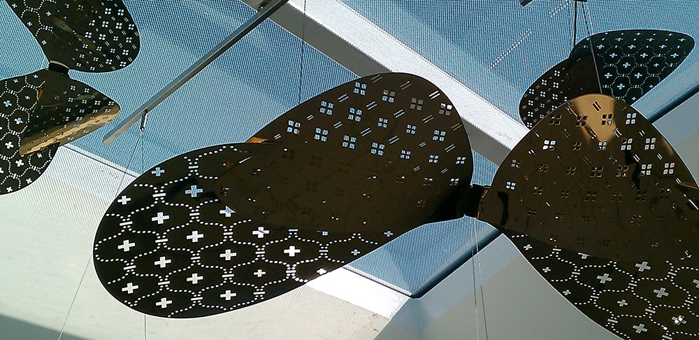 Description: Artwork plays an important role in the new elements of Brisbane airport. The Butterflies is a kinetic artwork display that was designed by HASSELL Associate Louise Pearson. It hangs in the skylights of the new boarding lounge and features almost 100 one metre wide, laser-cut butterflies that have been coloured with brass and bronze patinas.