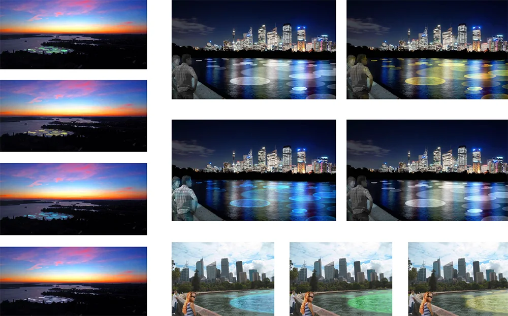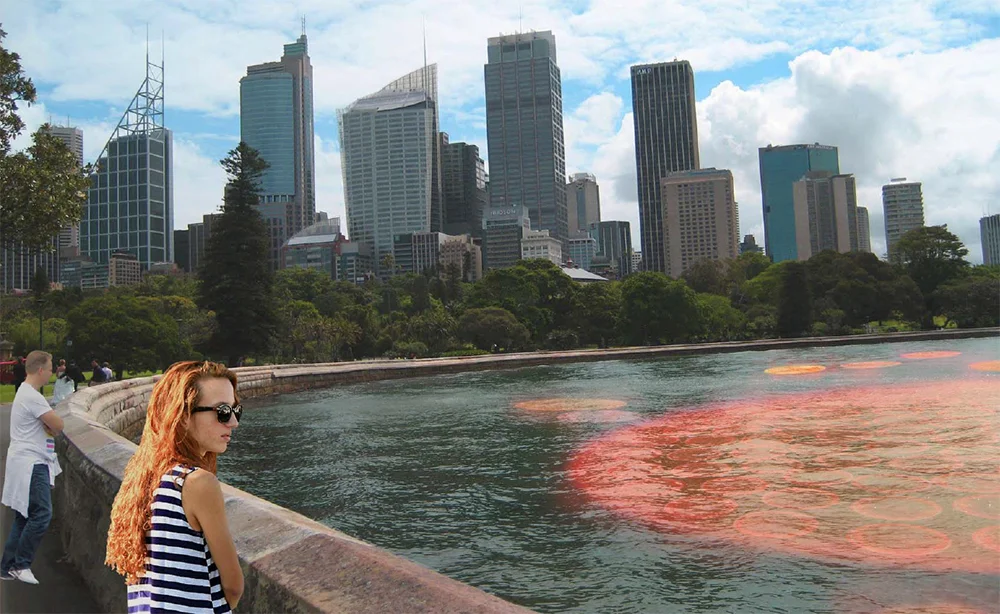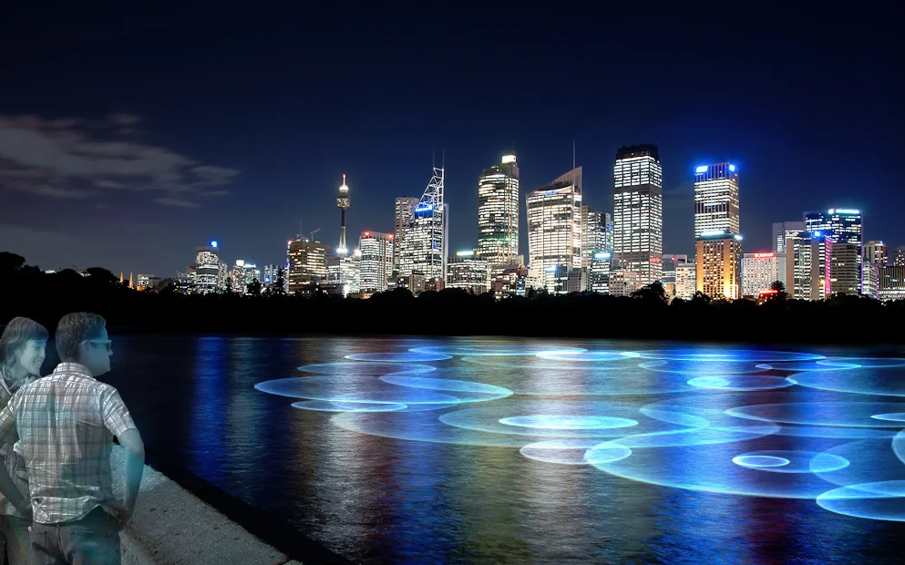 The installation transforms the seabed into a botanic oasis where the colours and masses of botanicals bloom brightly. The botanicals are presented as a body of light emerging from under the waters surface. The rings of light are positioned to abstractly mirror the circumferential placements of botanic trees that dot the surrounding landscape.