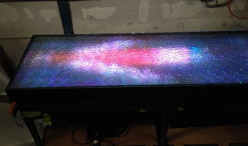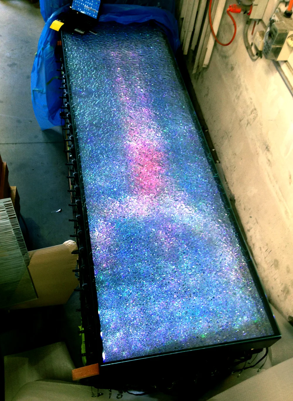 The intensity of the light box which is composed of several layers of glass with backlit LED’s has in itself a mysterious quality. The make up of the glass used in the light box has an unmeasured depth and feeling of water. When viewing the glass the observer will see movement, and a warped image imitating a waters rippling surface.