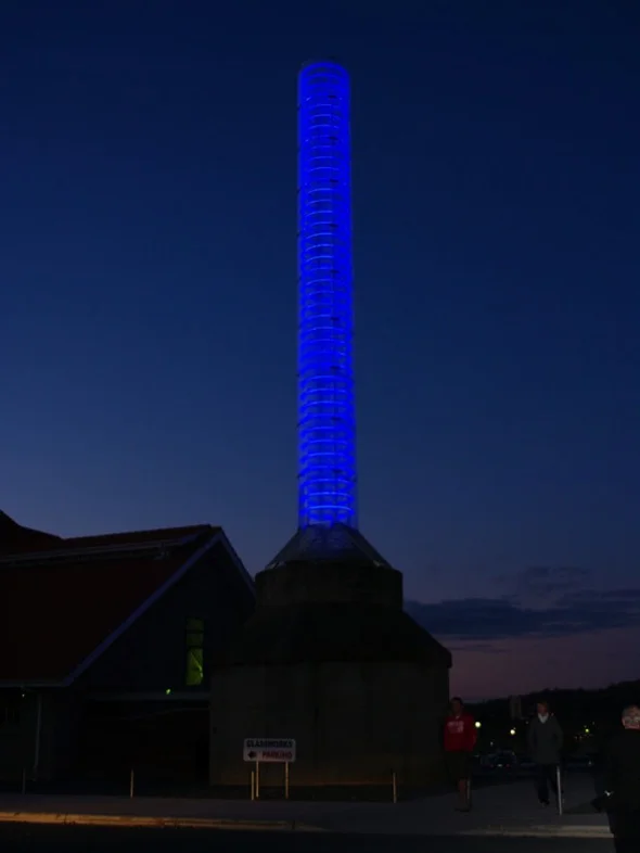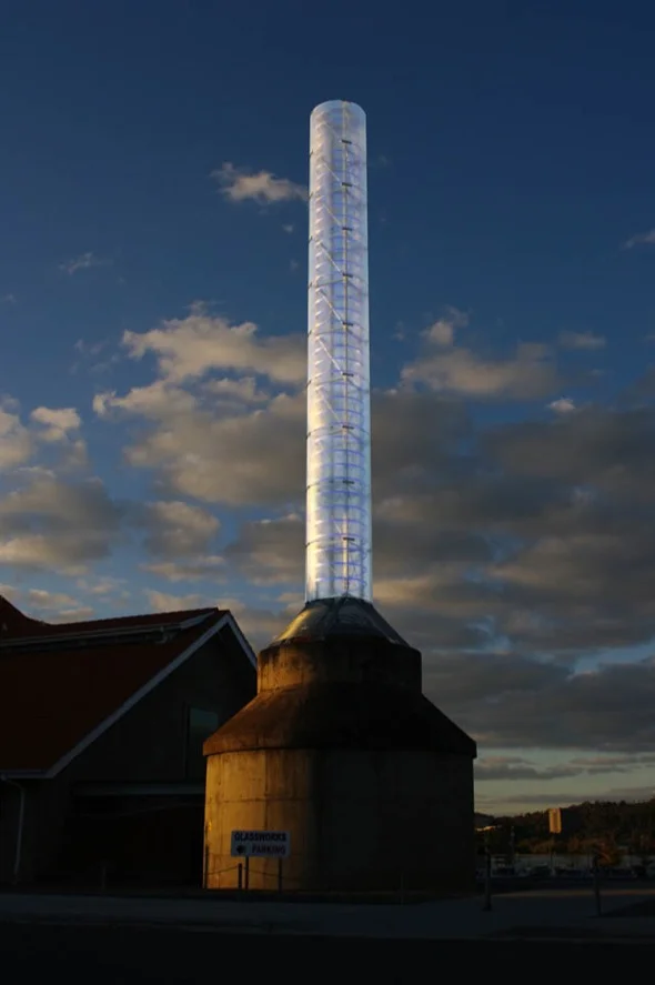 Titled 'Touching Lightly', the 23m high tower consists of a galvanised steel frame surrounded by Axolotl formed glass and rings of LED lights creating a low energy feature on the site of the old chimney stack. Each of the 56 panels of low iron glass were formed by Axolotl into a unique custom texture, which were then curved and mounted to the frame creating over 100 square metres of glass skin enveloping the entire structure.