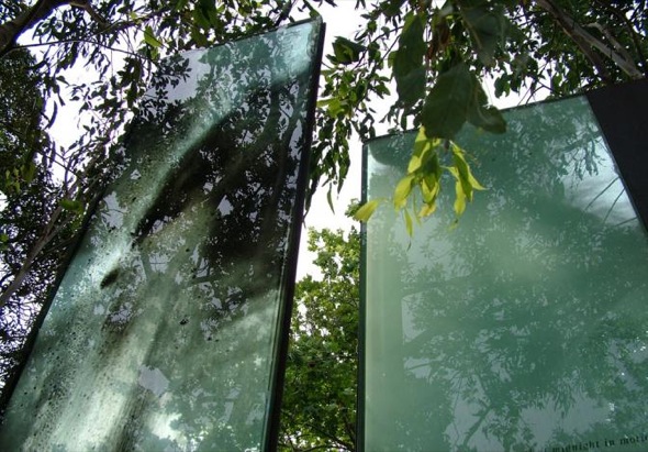 Description: In this installation with Jisuk Han, Laurence’s concerns and techniques are made evident. The work is anchored in history, and memory, and achieves a state of regeneration. The piece is architectural in its approach to the natural environment and through the fashioning of form and materials achieves a melding of the recently fabricated and the timelessness of nature. “Veil of Trees” is described in the Sydney Sculpture Walk Program as a one hundred meter curvilinear passage of new red gums, native grass planting, and glass panels containing ash, honey, seeds of indigenous plants, and resin, which runs along a grassed ridge between two roads in Sydney’s Domain. Some of the glass panels are engraved with quotations taken from various poems and essays by Australian authors, musing on the life of trees. The installation refers to an original stand of red gums laid low by the axe during early European settlement. Its message is moral and redemptive. In contrast to “Edge of the Trees”, the passage of the work is light and open and pastoral. The LED lights in the panels illuminate the passage by night creating a poetic and fluid environment that reflects both the architectural and natural surroundings. The installation stands half way between the real world of the trees and the shifting reflective world of the glass panels. Part is tangible: part is fleeting. This is an expanding work that exploits glass’s ability to extend the object and relate beyond itself, melding its own presence with that in front and behind its screen, connecting the trees in communion with the work. Paradoxical and ambiguous relationships occur, opening up endless possibilities for interpretation. Important among these are the parallels suggested between the human body and its dwelling in nature, the human body and its empathy with Laurence’s installation, the surrounding landscape and its melding with the glass and new plantings, and the symbiosis of art-nature within the work itself. This creation, with its thought-provoking revelations, suggests the possibilities for re-creation through the exploration and extension of what still remains of the natural world in the city.