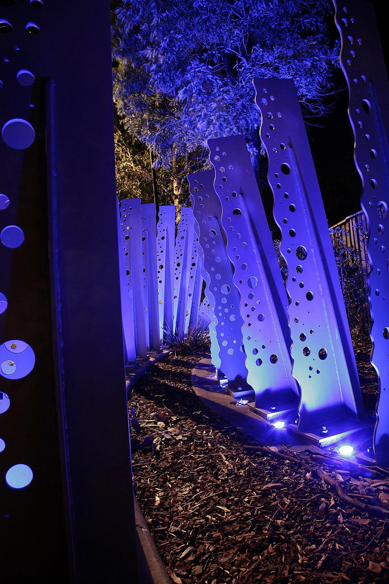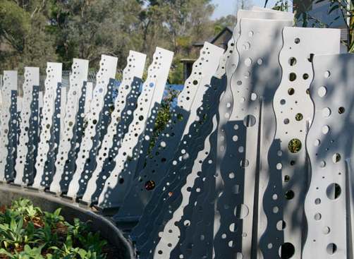 Description: A rhythm of perforated panels sways as it meanders through the landscape. This installation grew from collaboration with the Landscape Architecture team.